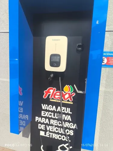 Carregador de 11 kWh em posto de combustível. Funciona 24 horas, 7 dias da semana.
