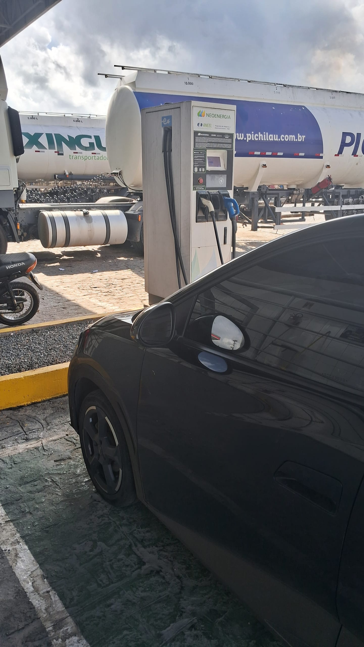 Posto de combustível com carregador de 50 kW e três conectores. O equipamento faz parte do projeto Corredor Verde, da Neoenergia.
