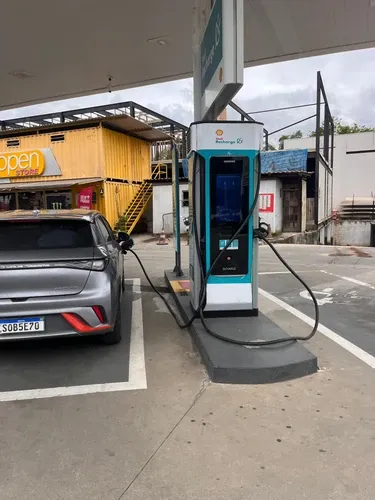 Carregador de 50kwh. Porém com dois carros potência cai pela metade. Tirando isso, localização é ótima, loja de conveniência boa, com mesas e cadeiras , posição de parar o carro muito boa !!!!